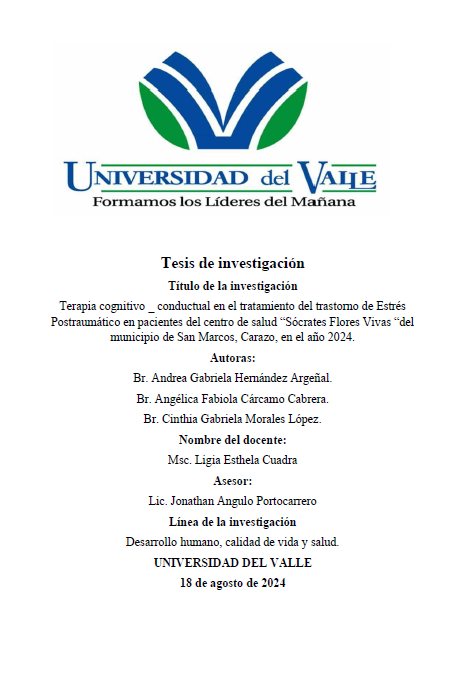 Esta tesis tiene como título: Terapia cognitivo _ conductual en el tratamiento del trastorno de Estrés Postraumático en pacientes del centro de salud “Sócrates Flores Vivas “del municipio de San Marcos, Carazo, en el año 2024.