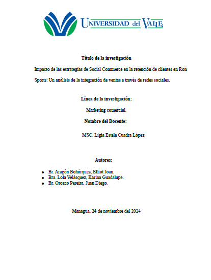 Esta investigación se enfoca en analizar las estrategias de Social Commerce aplicadas por Ron Sports en sus plataformas sociales y cómo estas impactan en la retención de clientes. Ron Sports, una tienda de artículos deportivos en Managua, presenta una presencia activa en redes sociales como Facebook e Instagram, pero enfrenta dificultades en convertir visitantes en compradores.