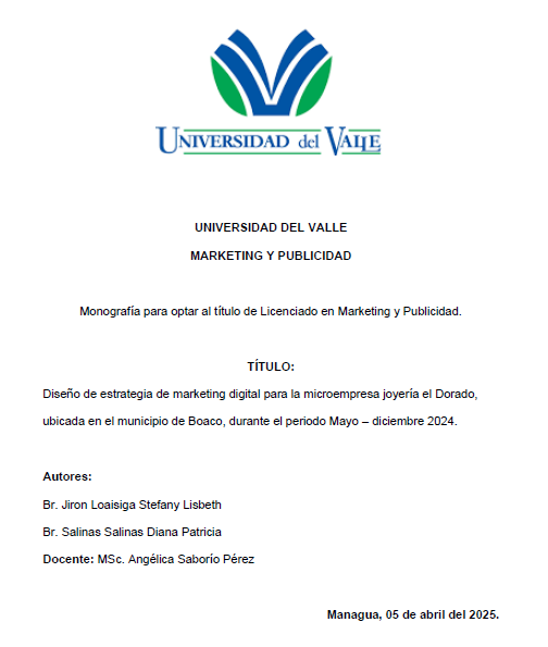 Joyería El Dorado es una microempresa que no ha implementado medios digitales para comercializar sus productos, a pesar de que los medios digitales representan la forma más efectiva de captar una mayor cantidad de clientes y competir en el mercado. Teniendo en cuenta esta problemática, la presente investigación ha sido realizada con el objetivo de diseñar una estrategia de marketing digital para la microempresa Joyería El Dorado, durante el periodo Mayo – diciembre 2024.