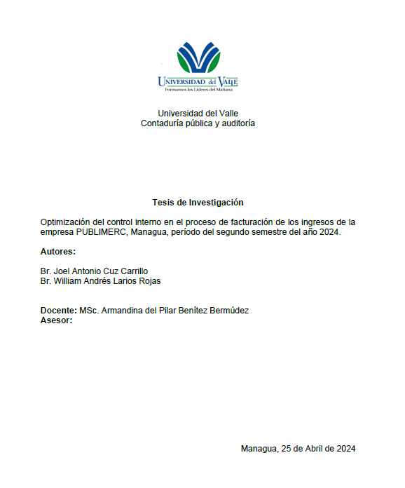 El control interno es un proceso de verificación contable en los departamentos de facturación, PUBLIMERC siendo una micro empresa dedicada a la distribución y comercialización de productos publicitarios, se brinda la oportunidad de mejorar su proceso en mira al crecimiento.
