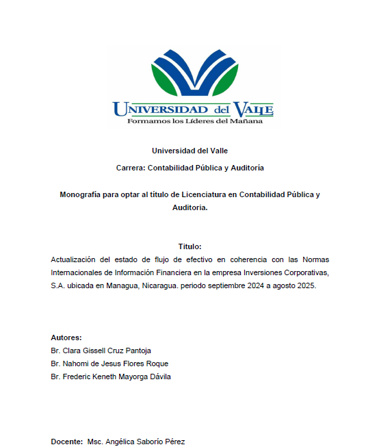 La presente investigación tiene como objetivo principal proponer la actualización del Estado de Flujos de Efectivo de la empresa Inversiones Corporativas, S.A., El estudio se fundamenta en referencias nacionales e internacionales como Sosa, (2019), y Chiavenato, citado por Soto et al., (2020), alineándose con el Plan Nacional de Lucha Contra la Pobreza (PNDH), los Objetivos de Desarrollo Sostenible (ODS) y los lineamientos de investigación la Universidad del Valle.