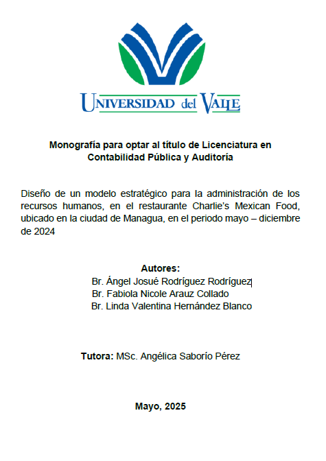 La presente investigación analiza la administración de los recursos humanos del restaurante Charlie’s Mexican Food en el periodo de mayo a diciembre del 2024, con la finalidad de diseñar un modelo estratégico. El estudio se fundamenta en referencias nacionales e internacionales como Sosa, (2019), y Chiavenato, citado por Soto et al., (2020), alineándose con el Plan Nacional de Lucha Contra la Pobreza (PNDH), los Objetivos de Desarrollo Sostenible (ODS) y los lineamientos de investigación la Universidad del Valle.