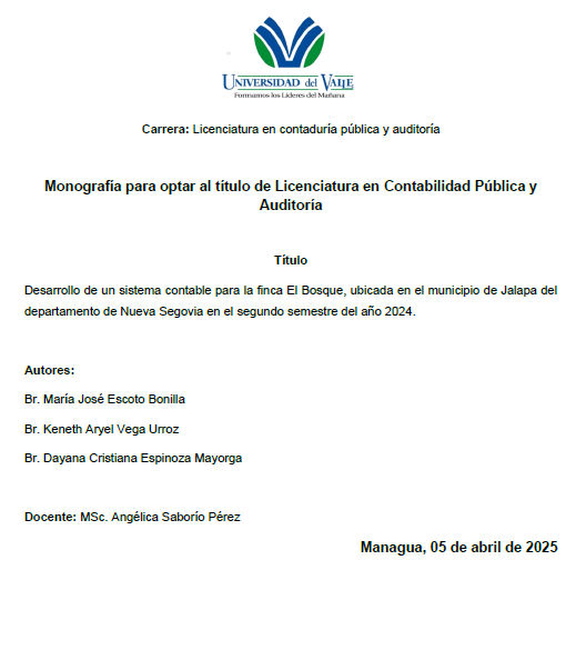 El presente estudio analiza la implementación de un sistema de control interno para préstamos entre particulares en la zona n.°4 de Ciudad Sandino, Managua, durante el periodo de mayo a diciembre de 2024. En Nicaragua, los préstamos entre personas han adquirido una gran relevancia económica, especialmente en zonas con acceso limitado a servicios financieros formales. Sin embargo, la falta de un control interno adecuado ha generado problemas como fraudes, tasas de interés abusivas y poca transparencia en las transacciones.