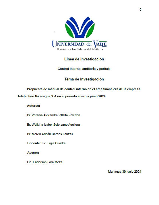 La presente investigación tiene como objetivo elaborar Propuesta de manual de control interno en el área financiera de la empresa Teletechno Nicaragua S.A en el periodo enero a junio 2024; las razones que motivó realizar este estudio, se deben a las respuestas brindadas en la entrevista directa, expresando la necesidad de establecer un Manual de Control Interno que garantice la transparencia, confiabilidad y eficiencia en la gestión contable y administrativa de la empresa. La ausencia de procedimientos documentados, la falta de supervisión sistemática y la inexistencia de mecanismos formales de evaluación han generado vulnerabilidades que pueden comprometer la estabilidad financiera y operativa de la organización