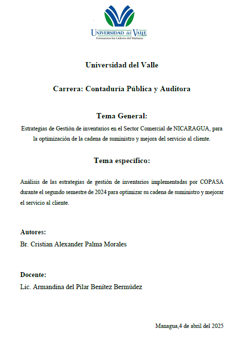 La presente investigación analiza las estrategias de gestión de inventarios de comercializadora panamericana s.a. (COPASA) durante el segundo semestre del 2024, con el objetivo de optimizar su cadena de suministro y mejorar el servicio al cliente. Para ello se realizó un estudio descriptivo con enfoque mixto, basado en entrevista y análisis de datos obtenidos directamente de la empresa.