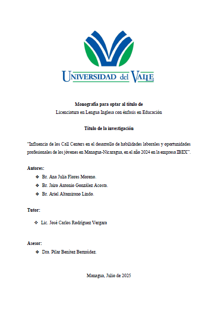 La influencia de los call center ha prevalecido en los últimos años, específicamente la empresa IBEX en Managua, Nicaragua, en el desarrollo de habilidades laborales y la generación de oportunidades profesionales para jóvenes de entre 18 y 30 años durante el año 2024. A través de un enfoque cuantitativo, se aplicaron encuestas estructuradas a 92 colaboradores de la empresa, permitiendo identificar las competencias adquiridas, el papel del dominio del inglés y las percepciones de los jóvenes respecto a su crecimiento profesional.