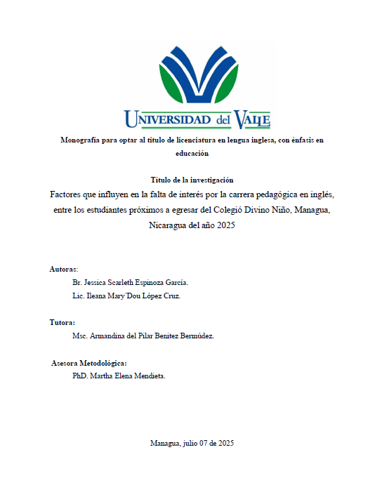 La educación constituye un pilar fundamental para el desarrollo integral de las personas, y la docencia desempeña un rol decisivo en la construcción de trayectorias vocacionales significativas. En este contexto, la presente investigación de enfoque cualitativo analiza el creciente desinterés por la carrera pedagógica en el área del idioma inglés entre los estudiantes de décimo y undécimo grado del Colegio Divino Niño, en Managua, Nicaragua, durante el año 2025, se identifican los factores académicos, sociales, económicos y culturales que influyen en la disminución del interés por esta profesión. Asimismo, se examinan las percepciones que los jóvenes tienen sobre la enseñanza del inglés y sus oportunidades laborales. Con base en estos hallazgos, se proponen estrategias que busquen revitalizar el interés por la carrera docente, reconociendo su valor social y su impacto transformador. Este estudio aspira a ser un insumo valioso para las instituciones educativas y los tomadores de decisiones, al tiempo que promueve una enseñanza del inglés no solo académicamente sólida, sino también socialmente significativa.