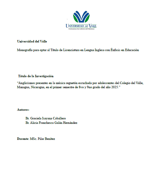 Esta investigación, de tipo descriptivo con enfoque cuantitativo, analiza la presencia de anglicismos en la música de reguetón y su influencia en el vocabulario de los adolescentes del Colegio del Valle en Managua, Nicaragua. Una tesis descriptiva se caracteriza por observar, detallar y analizar fenómenos tal como se presentan en un contexto determinado, sin manipular variables. En este caso, se describe y examina el uso de anglicismos en las letras de canciones populares de reguetón, así como su incorporación en el lenguaje cotidiano de los estudiantes, con base en datos obtenidos mediante encuestas estructuradas.