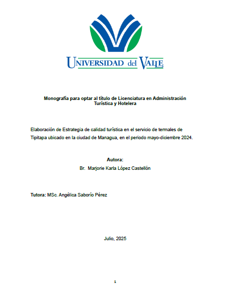 La presente investigación analiza la estrategia de calidad turística en el servicio de termales de Tipitapa ubicado en la ciudad de Managua, en el periodo mayo-diciembre 2024. El estudio se fundamenta en referencias nacionales e internacionales como Sosa (2019), y Chiavenato, citado por Soto et al. (2020(, alineándose con el Plan Nacional de Lucha Contra la Pobreza(PNDH), los objetivos de Desarrollo Sostenible (ODS) y los lineamientos de investigación la Universidad del Valle.