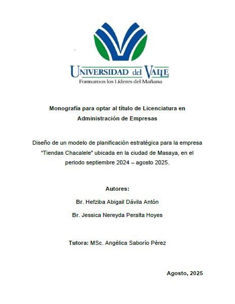 La presente investigación realiza un diagnóstico del estado actual, de los factores internos y externos que inciden en la empresa Tiendas Chacalele en el periodo septiembre 2024 y agosto 2025, con el objetivo de diseñar un modelo de planificación estratégica. El estudio se fundamenta con referencias nacionales e internacionales como: Bernal Torres, C. A., & Sierra Arango, H. D. (2013) y Chiavenato, I., & Sapiro, A. (2017), alineándose con el Plan Nacional de Lucha contra la Pobreza (PNDH), los objetivos de desarrollo sostenible (ODS), la estrategia nacional de educación y los lineamientos de la Universidad del Valle.