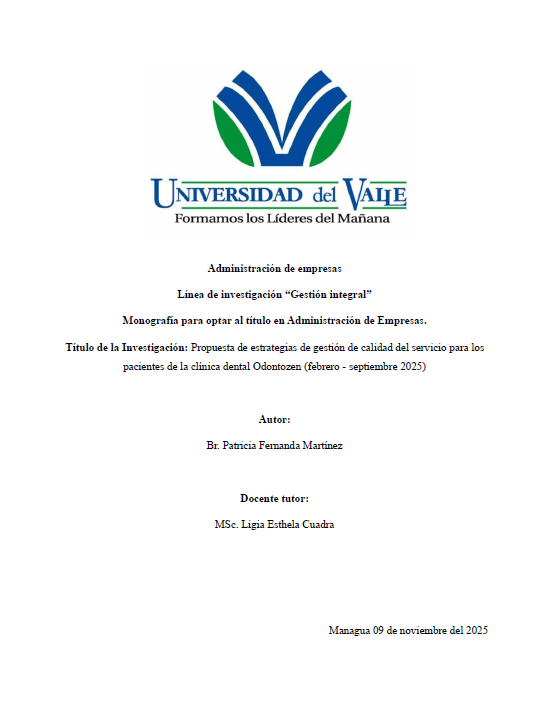 En la presente investigación se desarrolla un conjunto de estrategias de gestión de calidad del servicio para la Clínica dental OdontoZen, tras haber analizado su operatividad durante el periodo de febrero a septiembre de 2025. Ante la creciente demanda de excelencia en el sector salud, el estudio abordó la necesidad de OdontoZen de mejorar sus estrategias de calidad para potenciar la satisfacción y fidelización de sus pacientes.