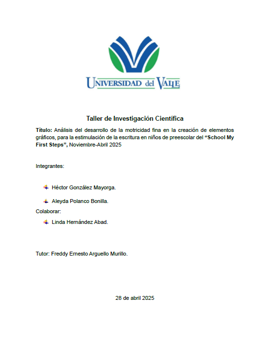 La presente investigación analiza el desarrollo de la motricidad fina en el proceso de creación de elementos gráficos como medio para estimular la escritura en niños de educación preescolar del School My First Steps, durante el período noviembre, 2024–abril 2025. El estudio parte del reconocimiento de que la motricidad fina es una habilidad esencial en la primera infancia, pues permite el control preciso de los movimientos de la mano, los dedos y la coordinación visomotora, indispensables para el dominio del trazo y la adquisición de la escritura.