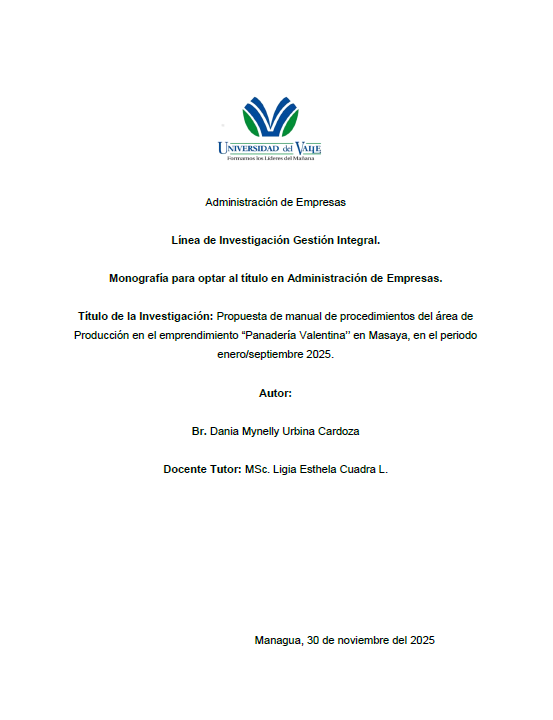 La investigación tiene como propósito un manual de procedimientos para el área de producción de la Panadería Valentina, ubicada en Masaya, Nicaragua. El problema radica en la ausencia de lineamientos estandarizados de trabajo, la prevalencia de prácticas operativas empíricas y la falta de control sistemático en los procesos productivos, lo cual limita la eficiencia, la calidad del producto y la capacidad de responder a la demanda del mercado.
