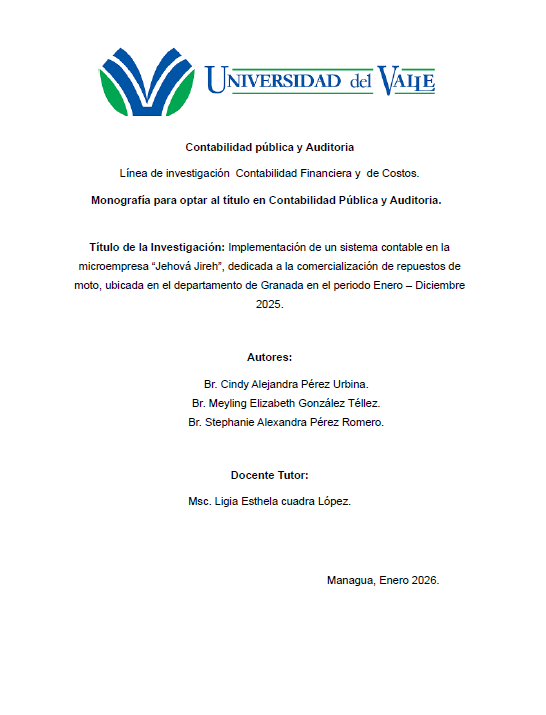El presente estudio aborda la implementación de un sistema contable en la microempresa “Jehová Jireh Granada”, dedicada a la comercialización de repuestos de motos, ubicada en el municipio de Granada, durante el periodo comprendido entre enero y diciembre de 2025. La empresa enfrentaba dificultades significativas relacionadas con el manejo manual y poco estructurado de sus registros contables, lo que afectaba la precisión de la información financiera y limitaba la toma de decisiones estratégicas.