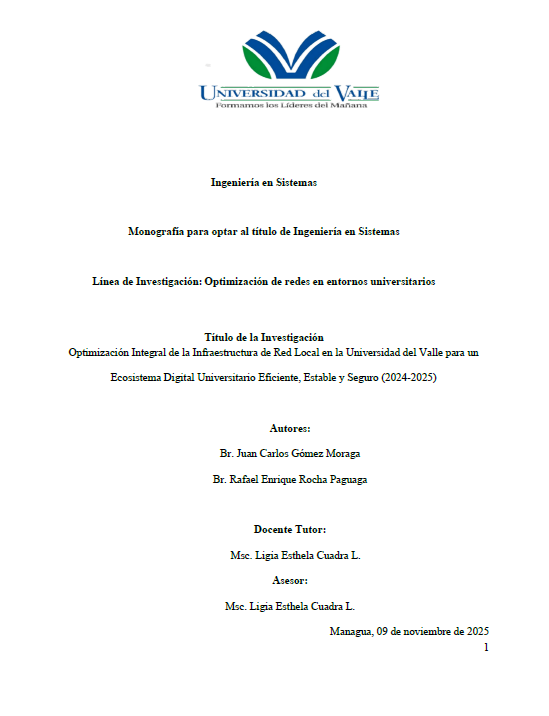 El presente proyecto de tesis aborda la Optimización Integral de la Infraestructura de Red Local (LAN) de la Universidad del Valle. En el contexto actual de rápida digitalización educativa, la infraestructura de red existente presenta limitaciones que impactan negativamente la calidad de los servicios digitales universitarios. Un ecosistema digital eficiente requiere una red subyacente que sea no solo rápida, sino también inherentemente estable y segura. El período de análisis y ejecución es 2024-2025.